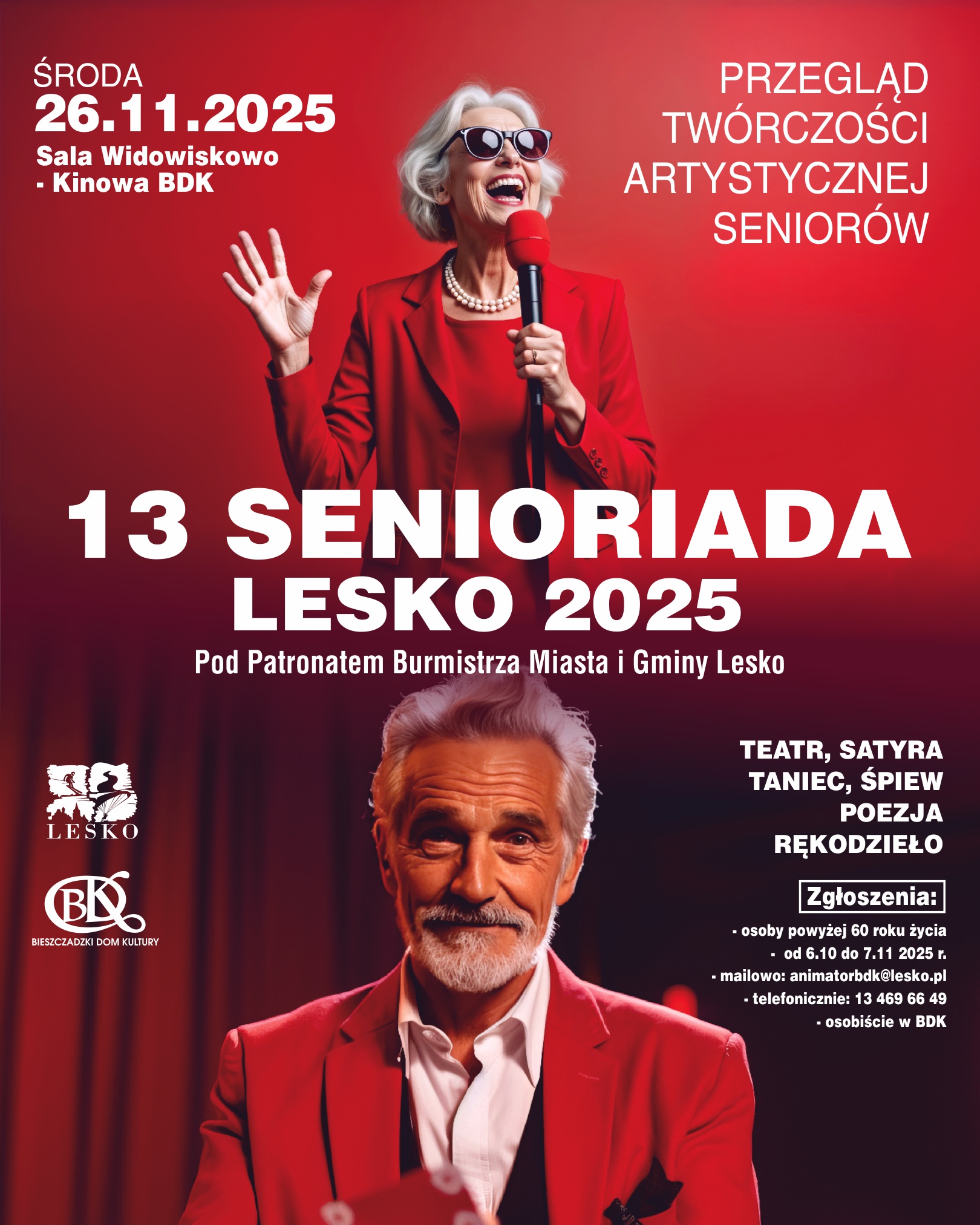 Z radością ogłaszamy, że XIII Senioriada Lesko 2025, czyli Przegląd Twórczości Artystycznej Seniorów, odbędzie się 26 listopada w sali widowiskowo-kinowej Bieszczadzkiego Domu Kultury w Lesku.