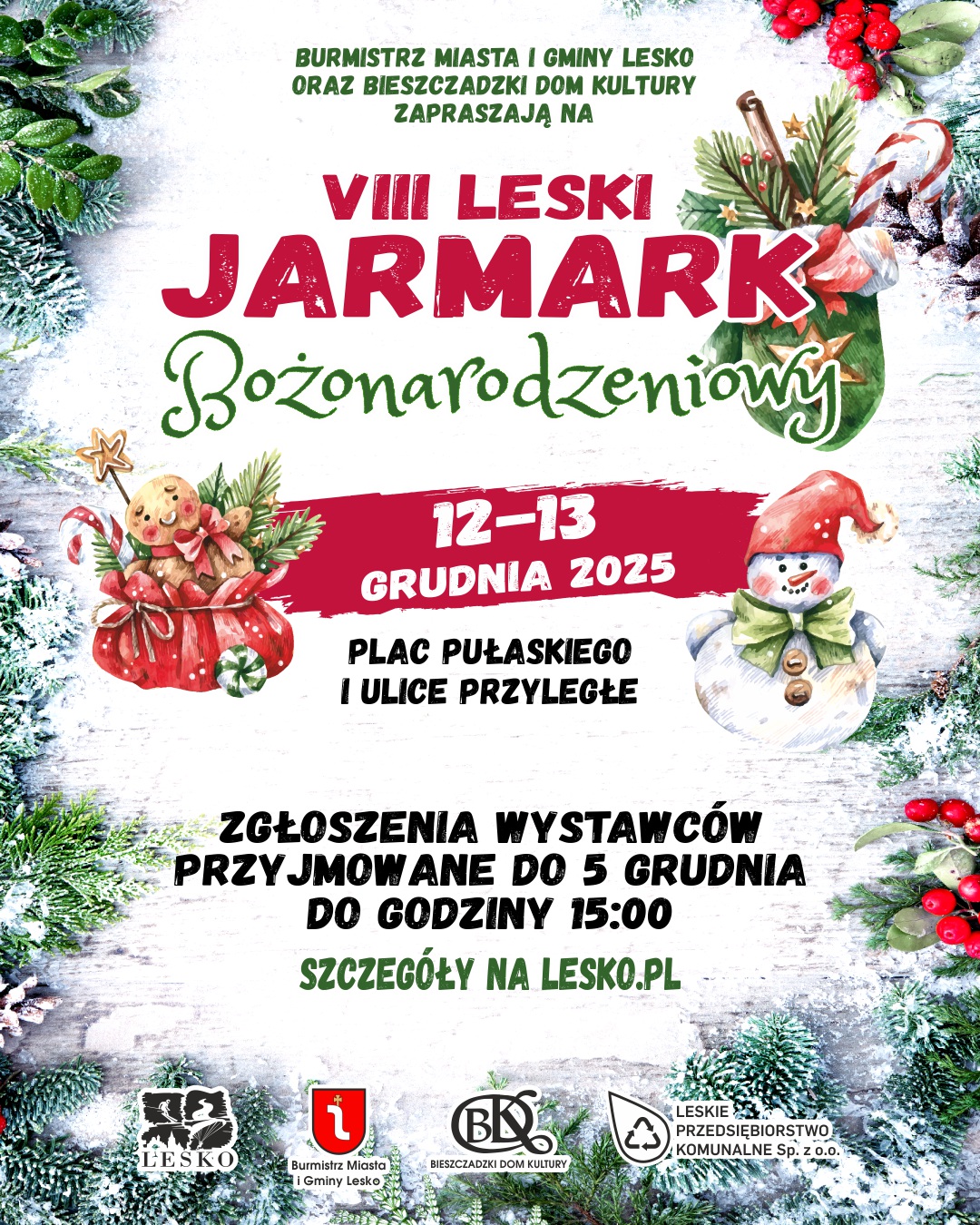 Burmistrz Miasta i Gminy Lesko, wraz z Bieszczadzkim Domem Kultury i Leskim Przedsiębiorstwem Komunalnym, serdecznie zaprasza wystawców do udziału w VIII Leskim Jarmarku Bożonarodzeniowym.
