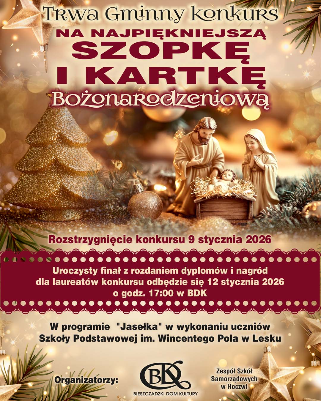 Bieszczadzki Dom Kultury w Lesku zaprasza do udziału w Gminnym Konkursie na Najpiękniejszą Szopkę oraz Kartkę Bożonarodzeniową.