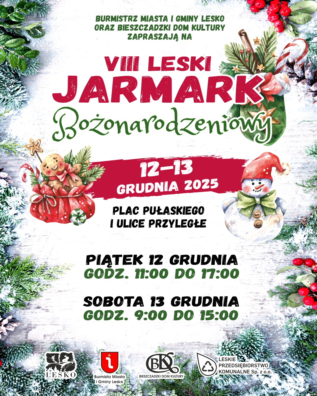 Burmistrz Miasta i Gminy Lesko oraz Bieszczadzki Dom Kultury serdecznie zapraszają na VIII Leski Jarmark Bożonarodzeniowy, który odbędzie się w dniach 12–13 grudnia 2025 roku na Placu Pułaskiego i przyległych ulicach.