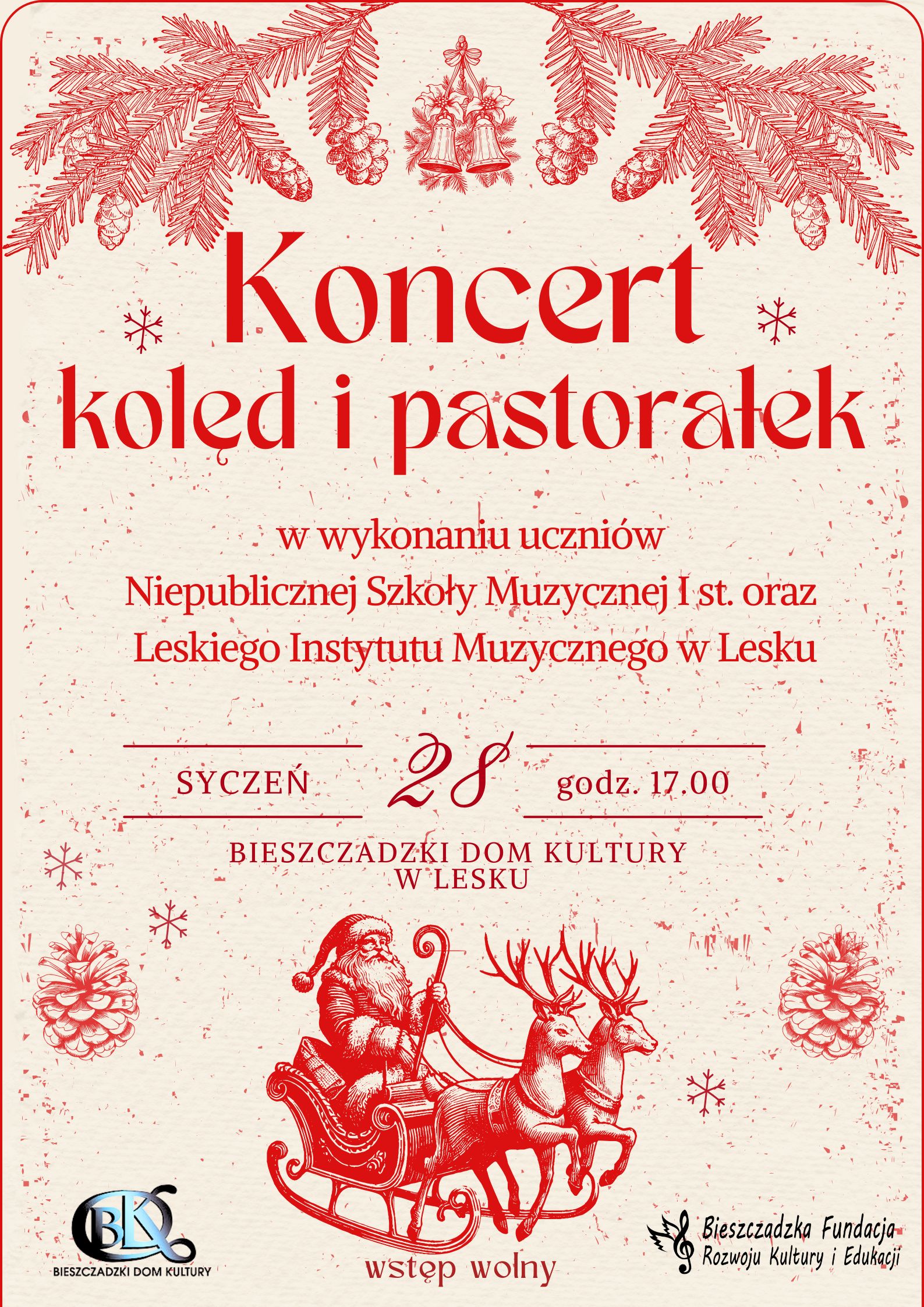 Serdecznie zapraszamy na „Koncert kolęd i pastorałek” w wykonaniu uczniów Niepublicznej Szkoły Muzycznej I stopnia oraz Leskiego Instytutu Muzycznego w Lesku.