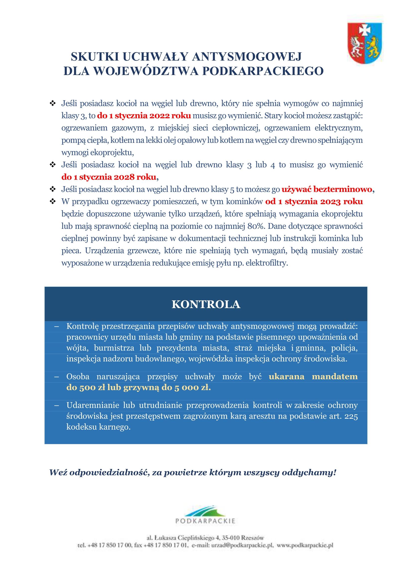 W celu zapobieżenia negatywnemu oddziaływaniu instalacji, w których następuje spalanie paliw, na zdrowie ludzi i środowisko, wprowadzono w granicach administracyjnych województwa podkarpackiego ograniczenia i zakazy uchwałą antysmogową podjętą w dniu 23 kwietnia 2018 roku.