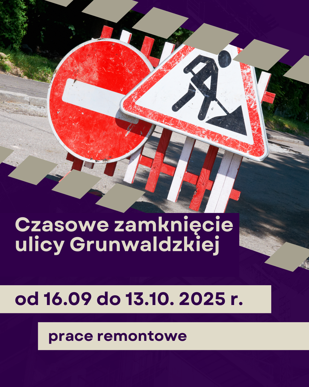 Od 16 września rozpoczynają się prace remontowe na ulicy Grunwaldzkiej. W związku z prowadzonymi robotami droga będzie zamknięta dla ruchu pojazdów i pieszych codziennie w godzinach od 8:00 do 16:00.