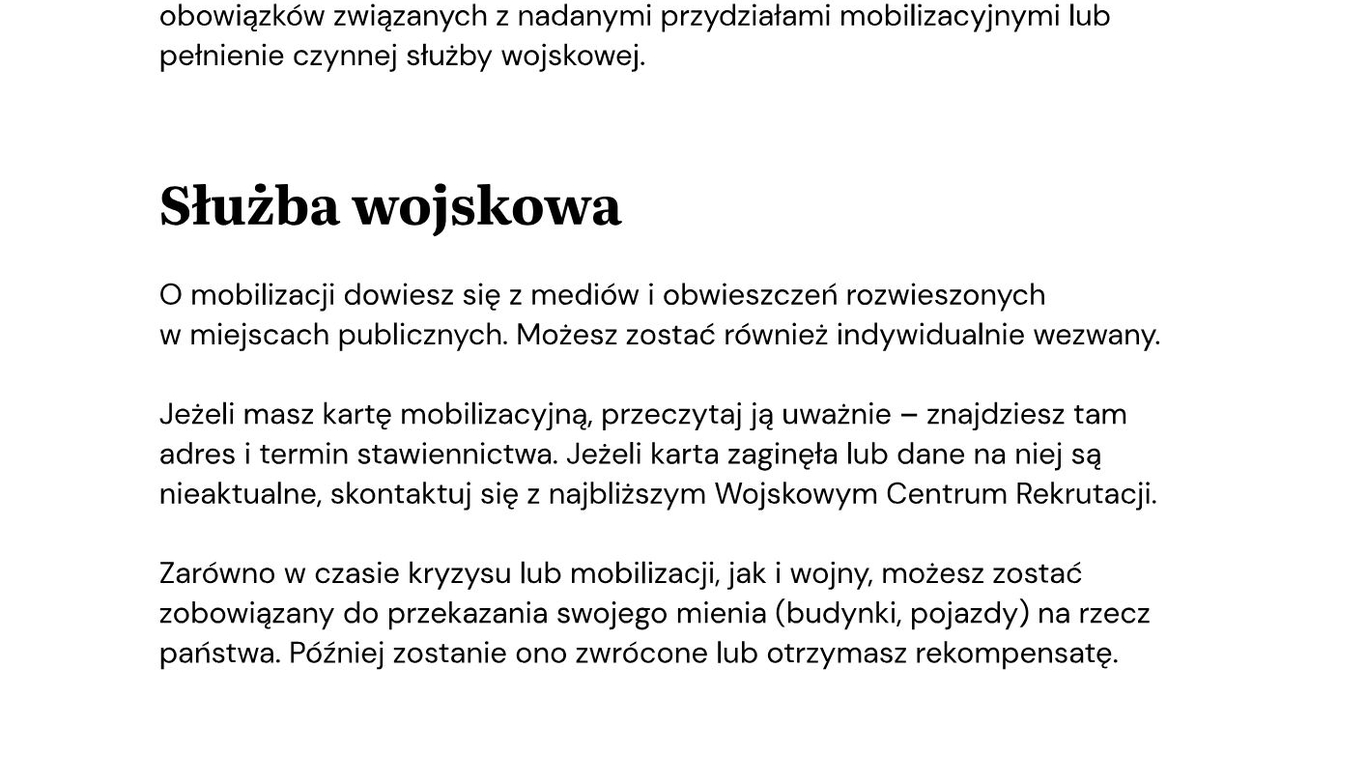 - wykonywanie zadań na rzecz obrony (np. wsparcie logistyczne, pomoc ewakuacyjną),