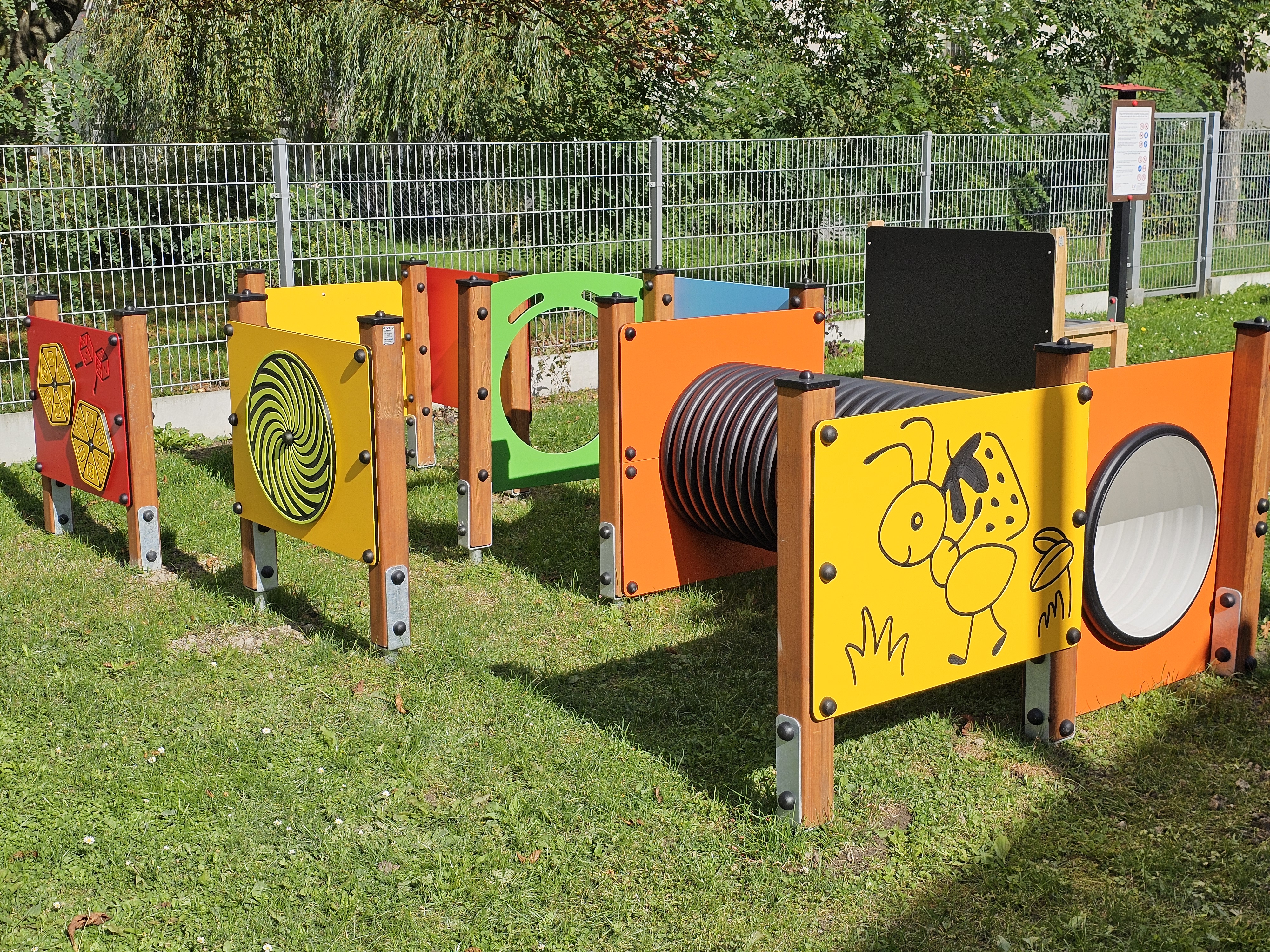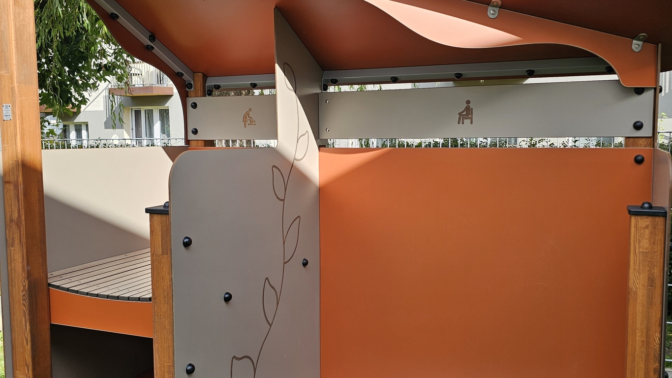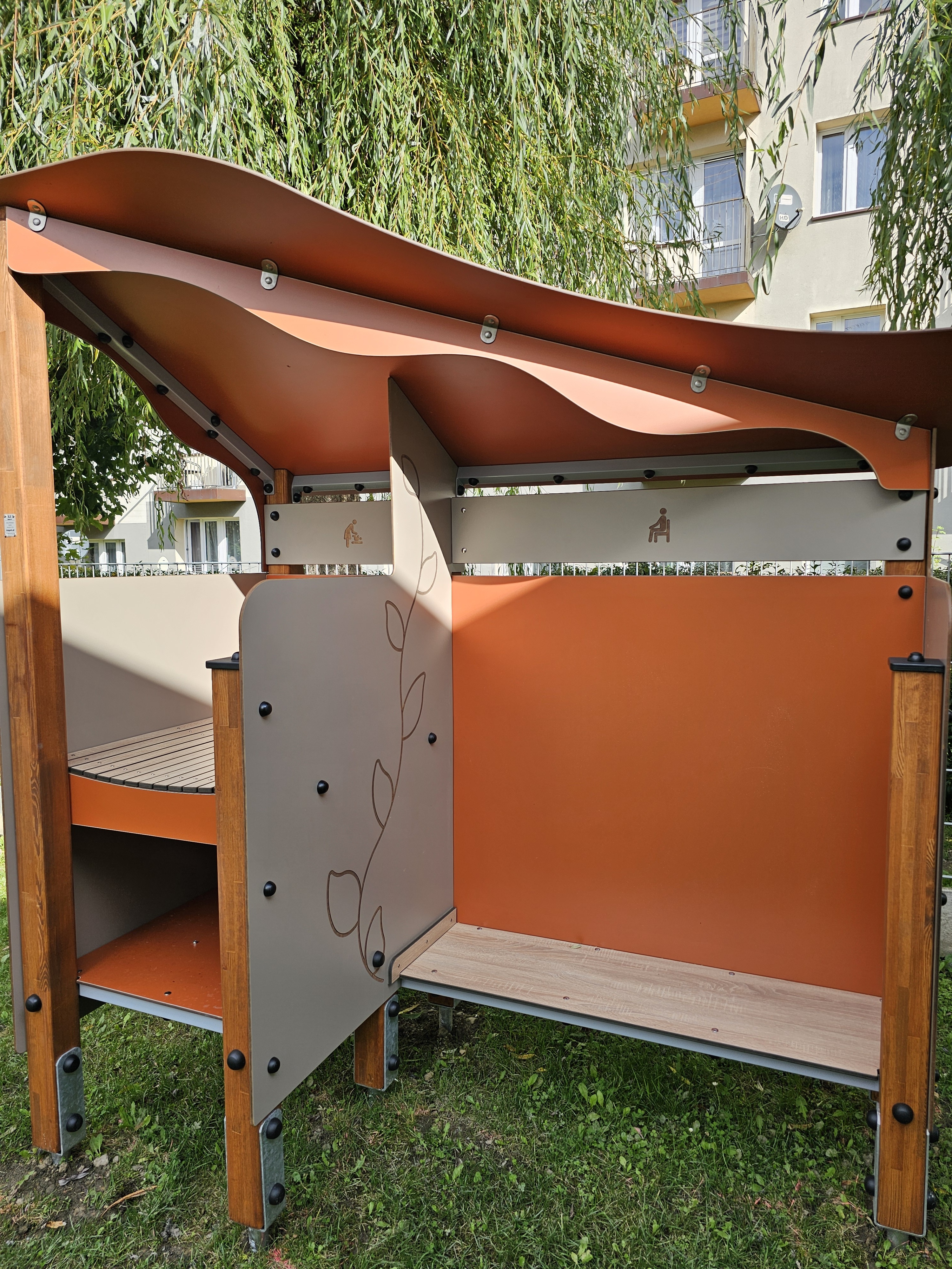 Dla większego komfortu najmłodszych wykonano również zacienienie części terenu przy pomocy żagli przeciwsłonecznych oraz przenośne ogrodzenie, umożliwiające elastyczne wydzielanie przestrzeni do różnych form zabawy.