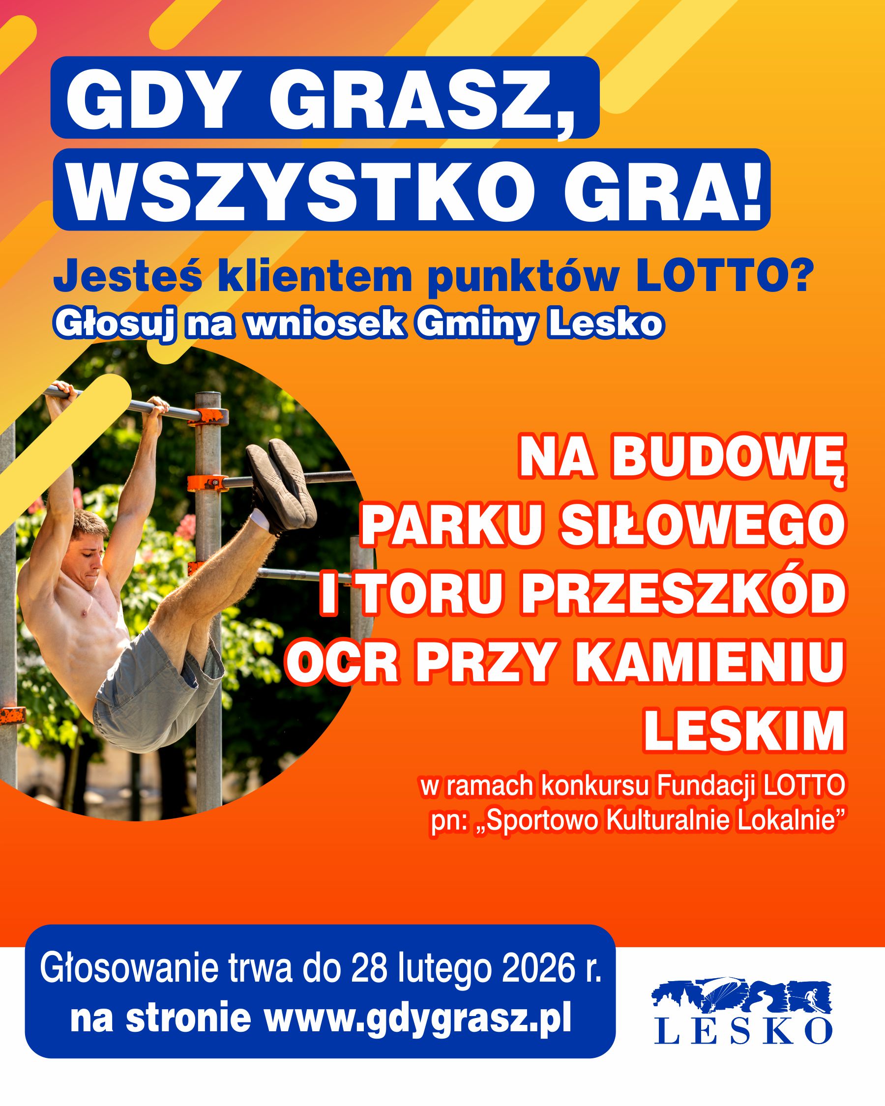 Gmina Lesko bierze udział w konkursie Fundacji LOTTO „Sportowo Kulturalnie Lokalnie”, a stawką jest budowa nowoczesnego, ogólnodostępnego parku siłowego i toru przeszkód OCR „WildRock Lesko” u podnóża Kamienia Leskiego.
