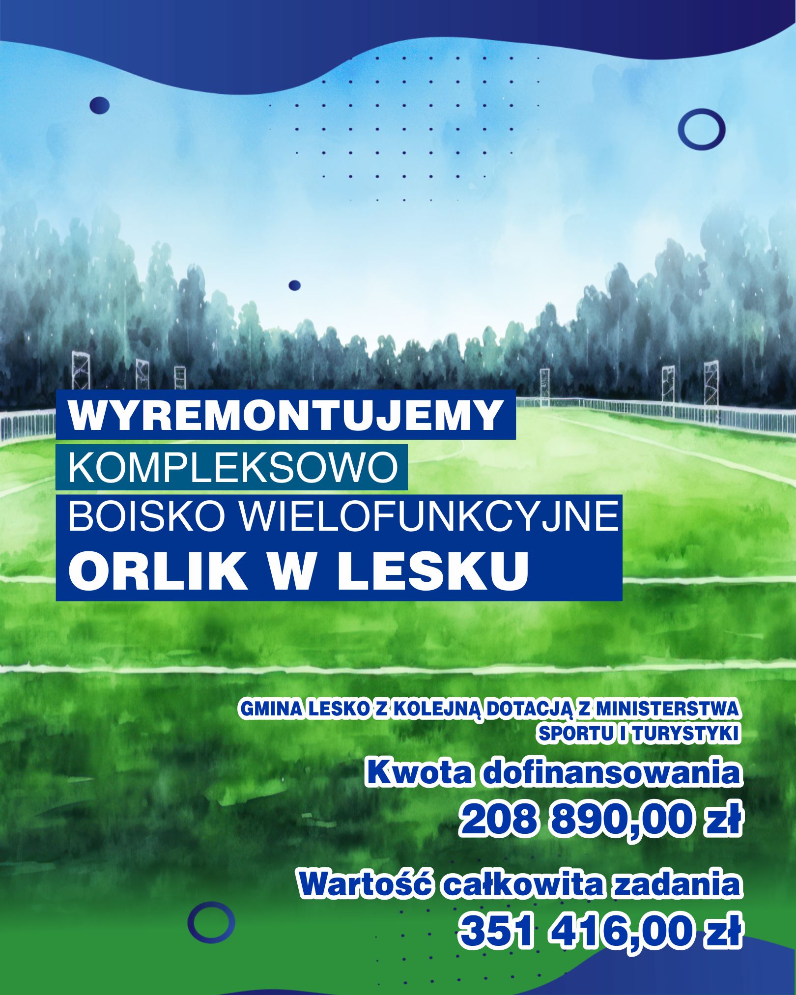 To już drugie wsparcie finansowe z Ministerstwa Sportu i Turystyki przeznaczone na modernizację leskiego Orlika. W czerwcu ubiegłego roku gmina otrzymała 243 000,00 zł na realizację pierwszego etapu inwestycji, którego całkowita wartość wynosi 486 078,00 zł. W jego ramach wymieniona zostanie nawierzchnia boiska piłkarskiego z trawy syntetycznej wraz z warstwą wyrównawczą, bramki, siatki oraz piłkochwyty. Zmodernizowane zostanie również ogrodzenie, a istniejące oświetlenie zastąpią energooszczędne oprawy LED. Obiekt zostanie także objęty monitoringiem.