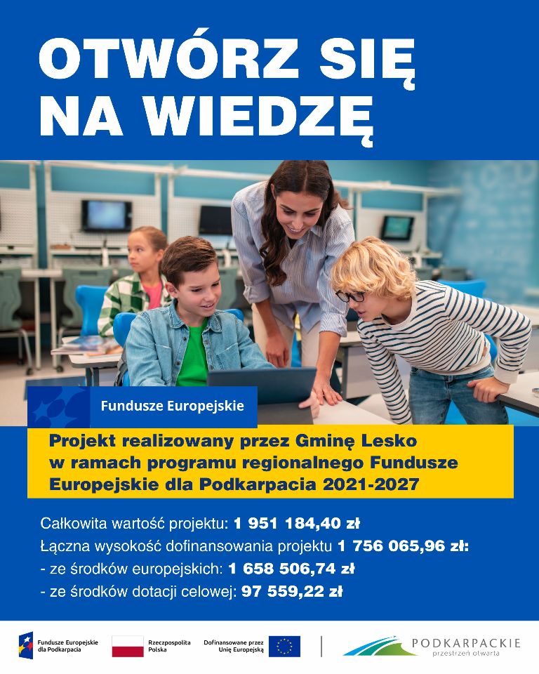 Projekt „Otwórz się na wiedzę” obejmuje modernizację wszystkich szkół podstawowych na terenie gminy Lesko. Łączna wartość całego przedsięwzięcia to 1 951 184,40 zł, z czego 1 756 065,96 zł stanowi dofinansowanie. Na tę kwotę składają się 1 658 506,74 zł ze środków europejskich oraz 97 559,22 zł z dotacji celowej.
