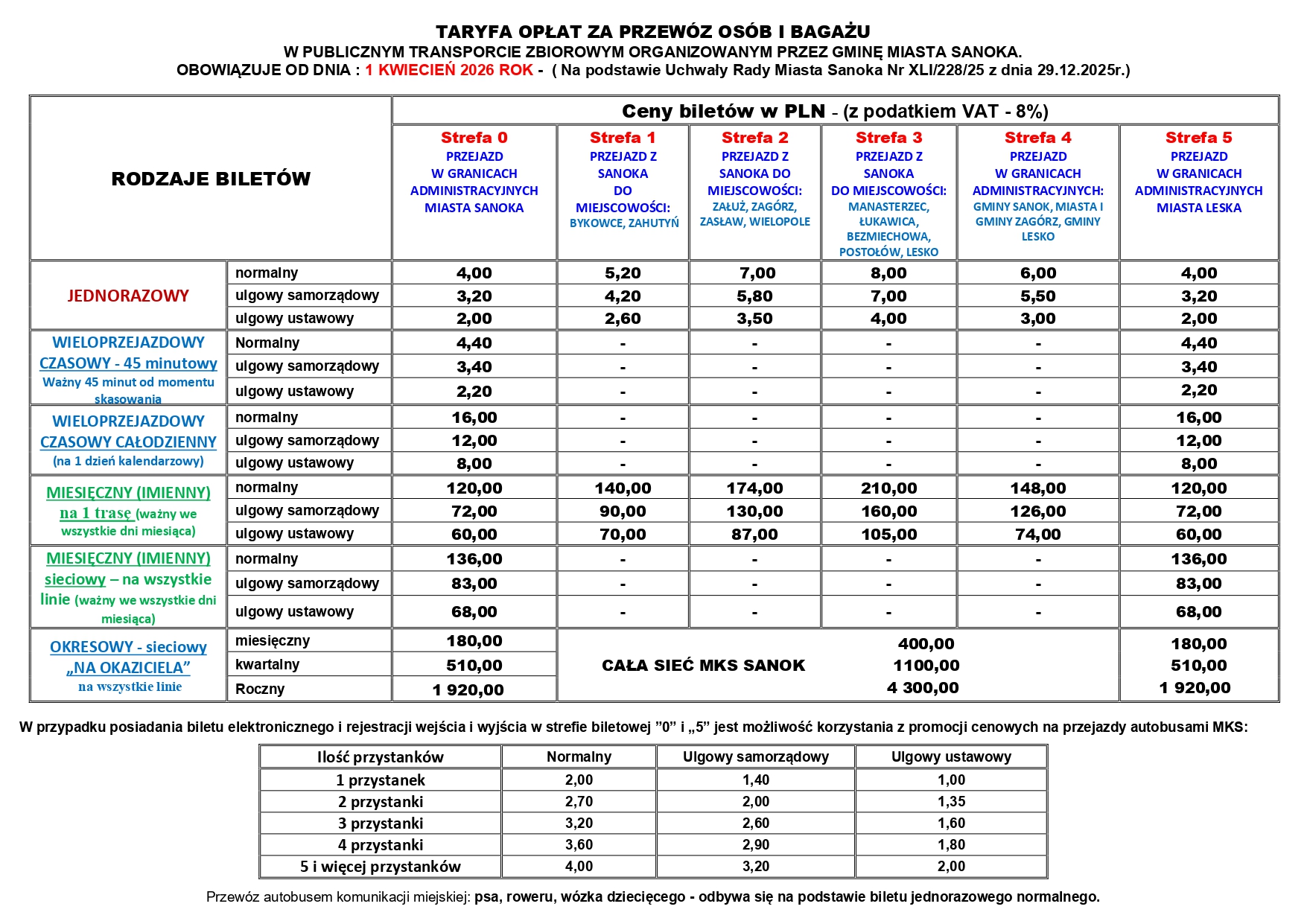 - Osoby niezdolne do samodzielnej egzystencji, całkowicie niezdolne do pracy lub mający ustalony znaczny stopień niepełnosprawności oraz towarzyszący im podczas przejazdu ich opiekunowie – na podstawie imiennego biletu elektronicznego wydanego przez Sanockie Przedsiębiorstwo Gospodarki Komunalnej Spółka z o.o w Sanoku.