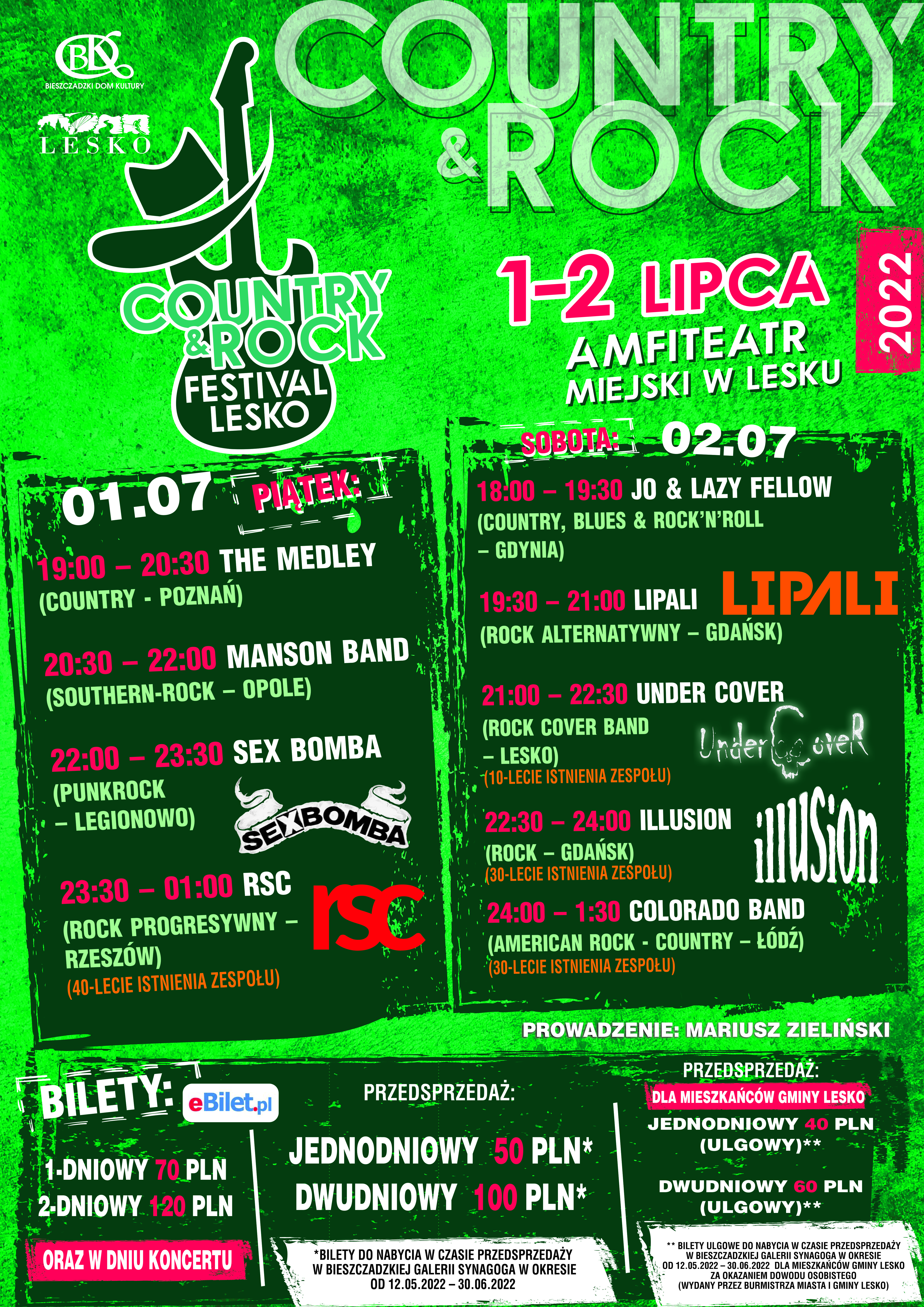 ultowe wydarzenie w przepięknej bramie Bieszczad - XXXIV edycja Country Festiwalu w Lesku. Od 2021 roku festiwal wzbogacony o muzykę dla fanów rocka zmienił nazwę na Country & Rock Festival Lesko. Na naszej scenie lubiane przez Was nuty country i zupełnie nowe brzmienia artystów polskiej sceny rockowej!!