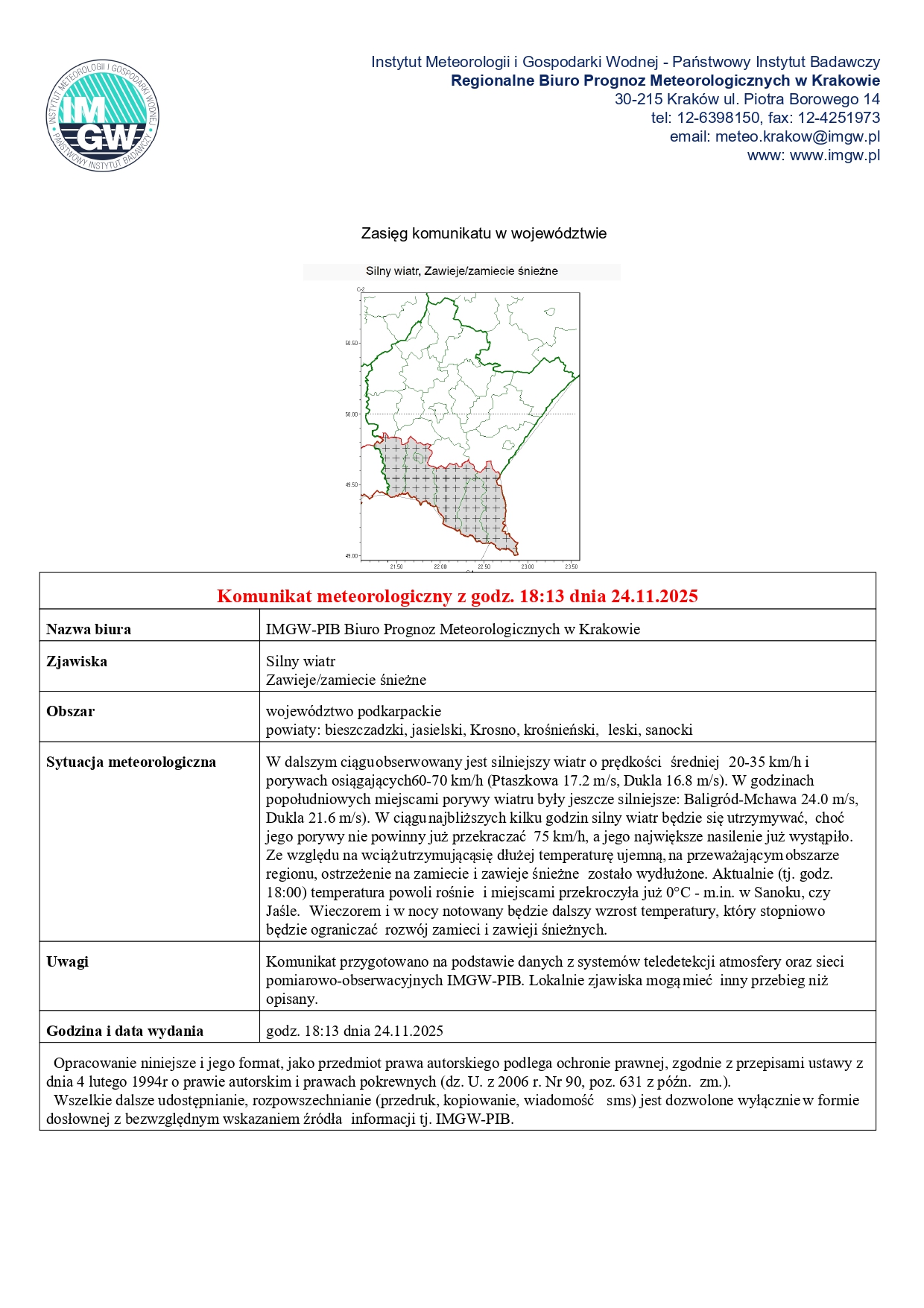 Komunikat meteorologiczny z godz. 18:13 dnia 24.11.2025