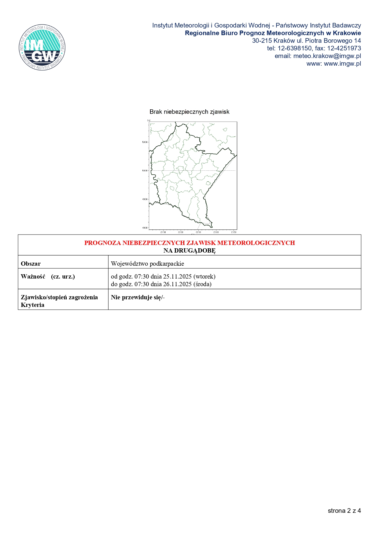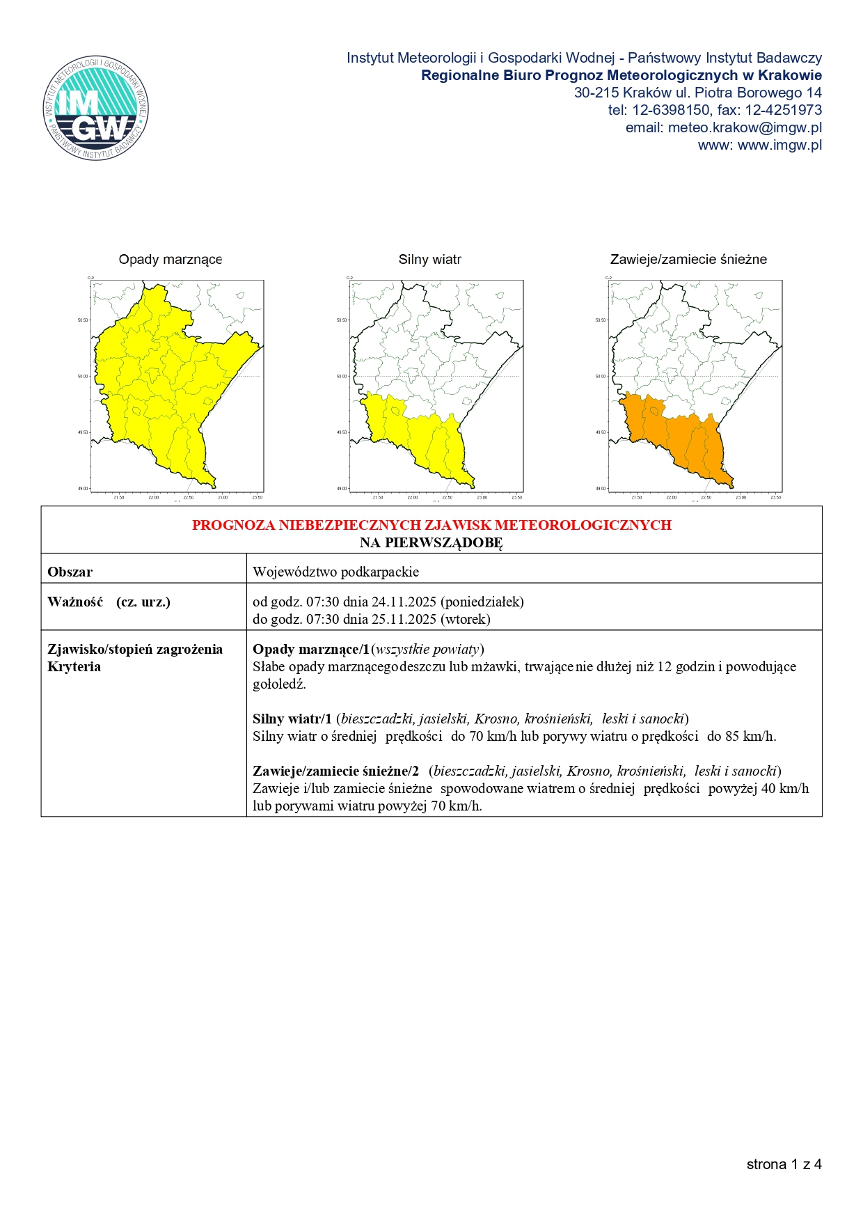 PROGNOZA NIEBEZPIECZNYCH ZJAWISK METEOROLOGICZNYCH 24-28.11.2025