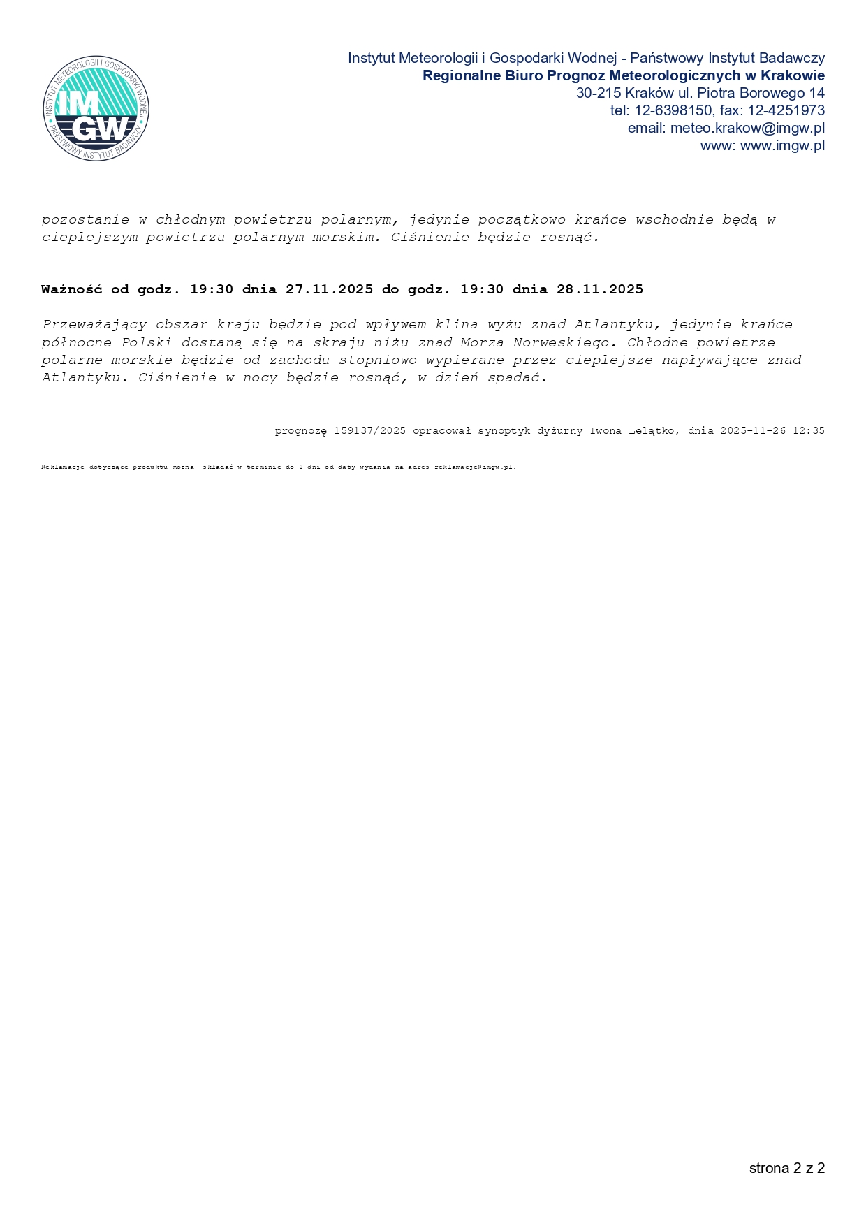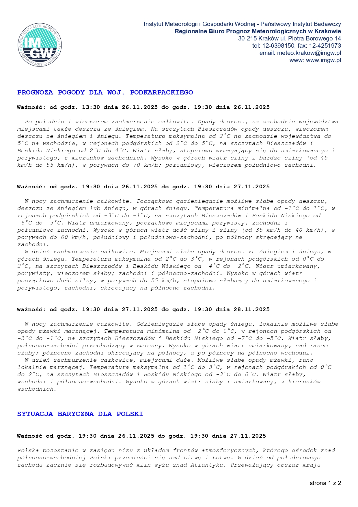 PROGNOZA POGODY DLA WOJ. PODKARPACKIEGO 26-28.11.2025
