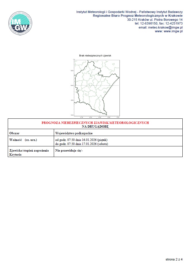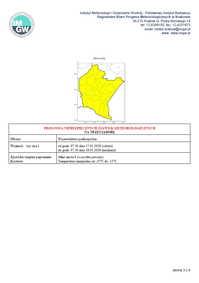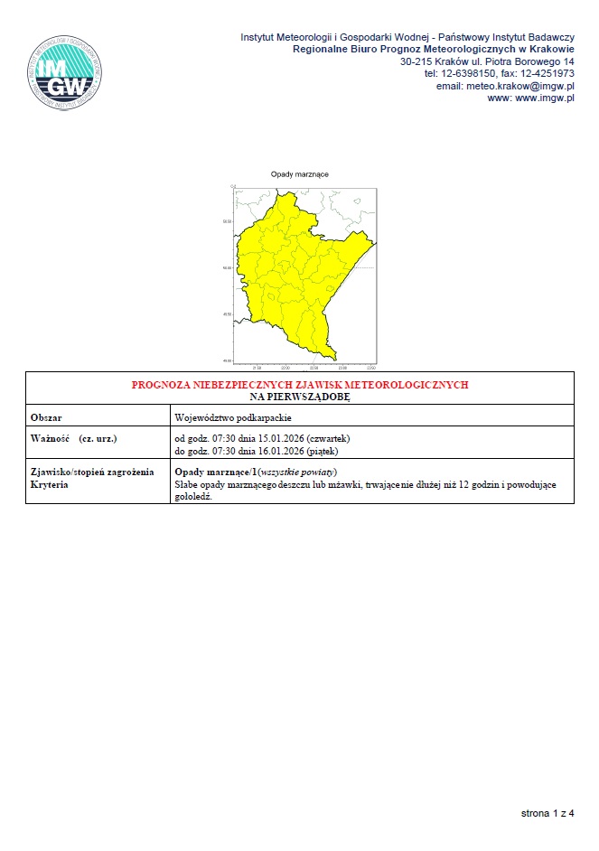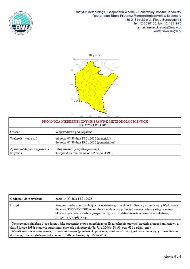 Prognoza niebezpiecznych zjawisk - 14.01.2026 r.
