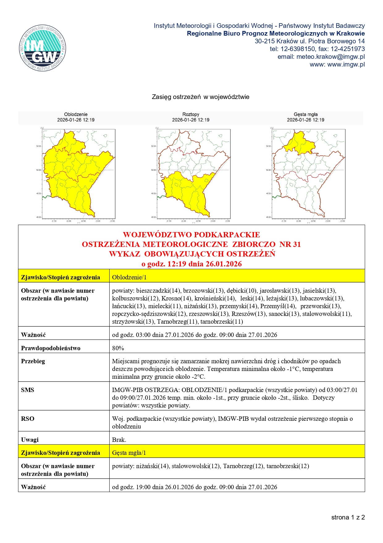 WOJEWÓDZTWO PODKARPACKIE OSTRZEŻENIA METEOROLOGICZNE ZBIORCZO NR 31 WYKAZ OBOWIĄZUJĄCYCH OSTRZEŻEŃ z dnia 26.01.2026