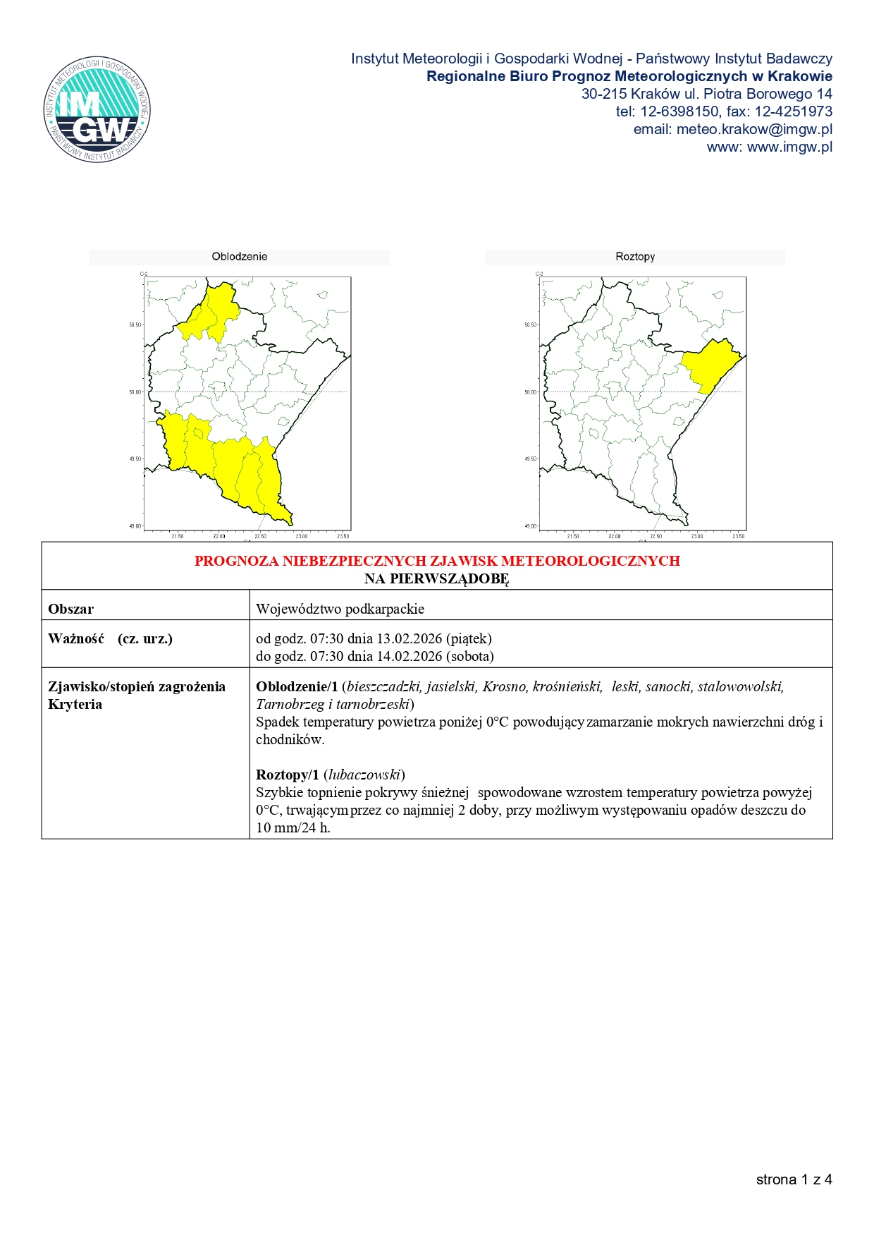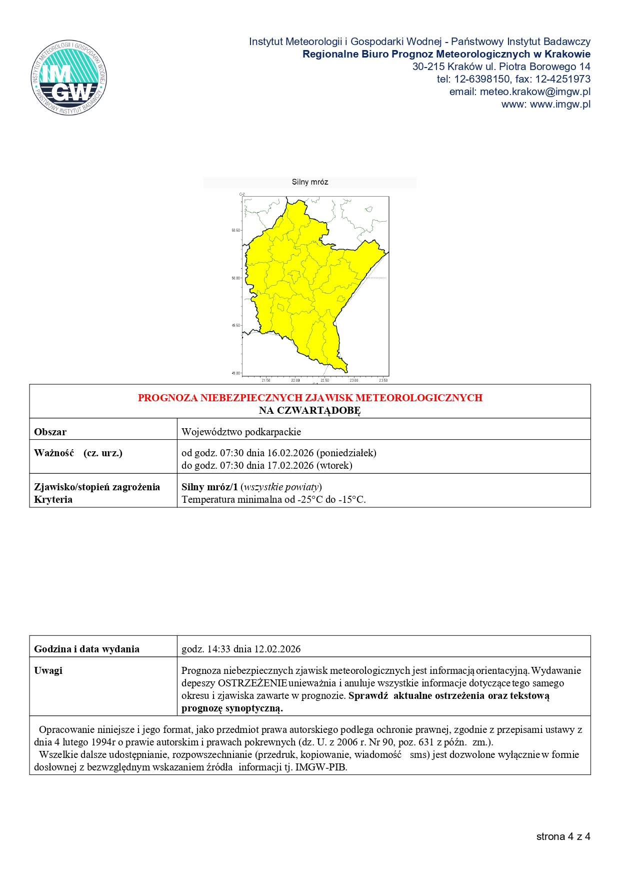 PROGNOZA NIEBEZPIECZNYCH ZJAWISK METEOROLOGICZNYCH 12.02.2026
