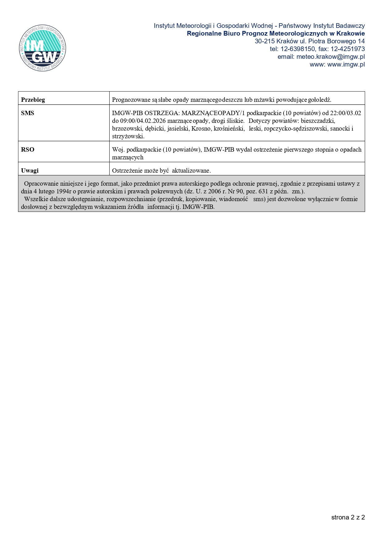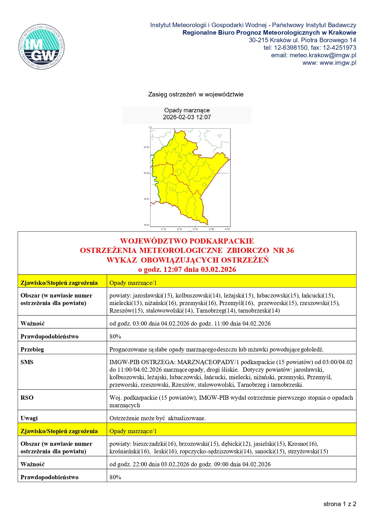 WOJEWÓDZTWO PODKARPACKIE OSTRZEŻENIA METEOROLOGICZNE ZBIORCZO NR 36 WYKAZ OBOWIĄZUJĄCYCH OSTRZEŻEŃ z dnia 03.02.2026