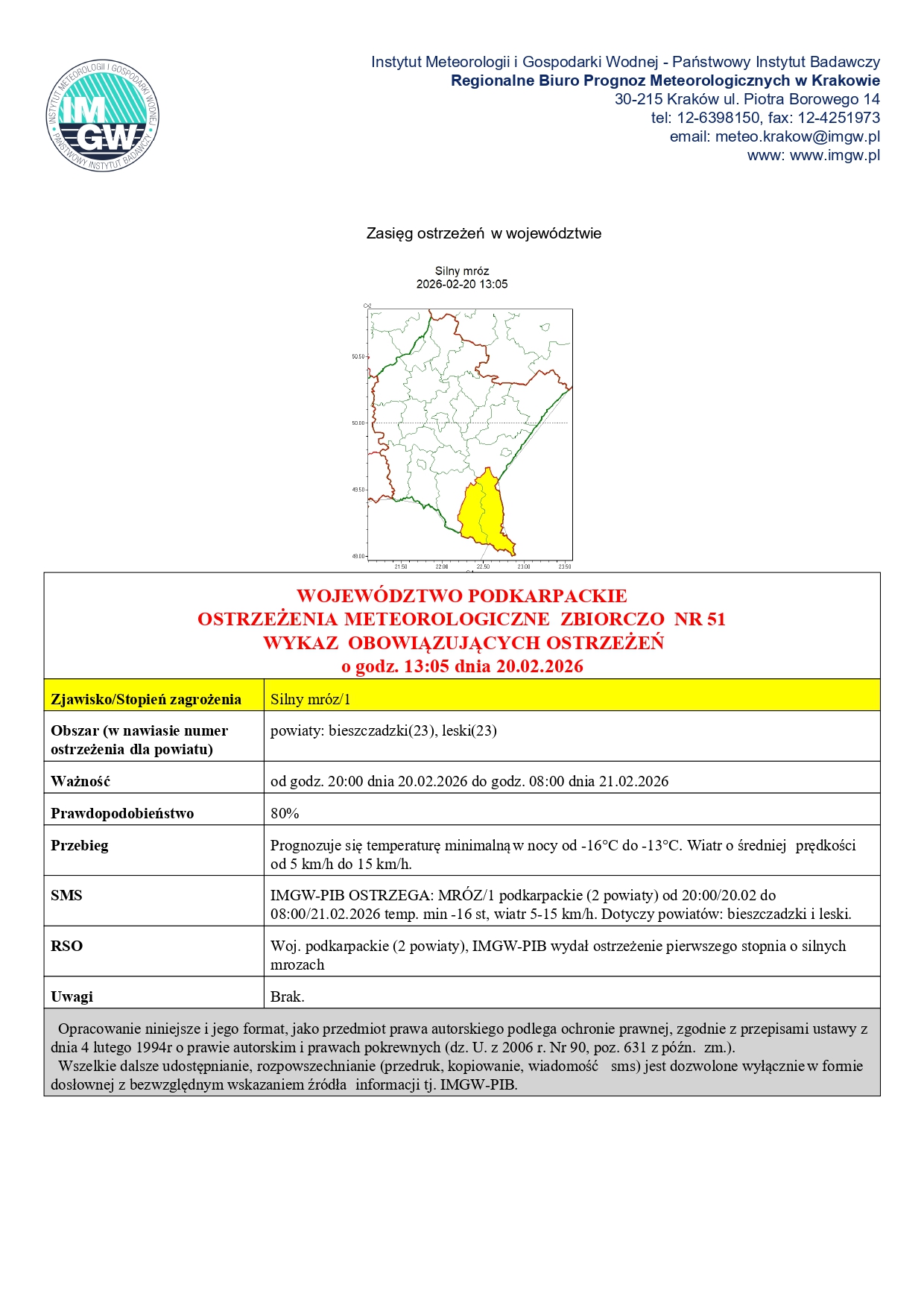 WOJEWÓDZTWO PODKARPACKIE OSTRZEŻENIA METEOROLOGICZNE ZBIORCZO NR 51 WYKAZ OBOWIĄZUJĄCYCH OSTRZEŻEŃ z dnia 20.02.2026